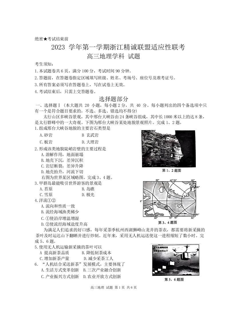 浙江省精诚联盟2024届高三上学期12月适应性联考地理