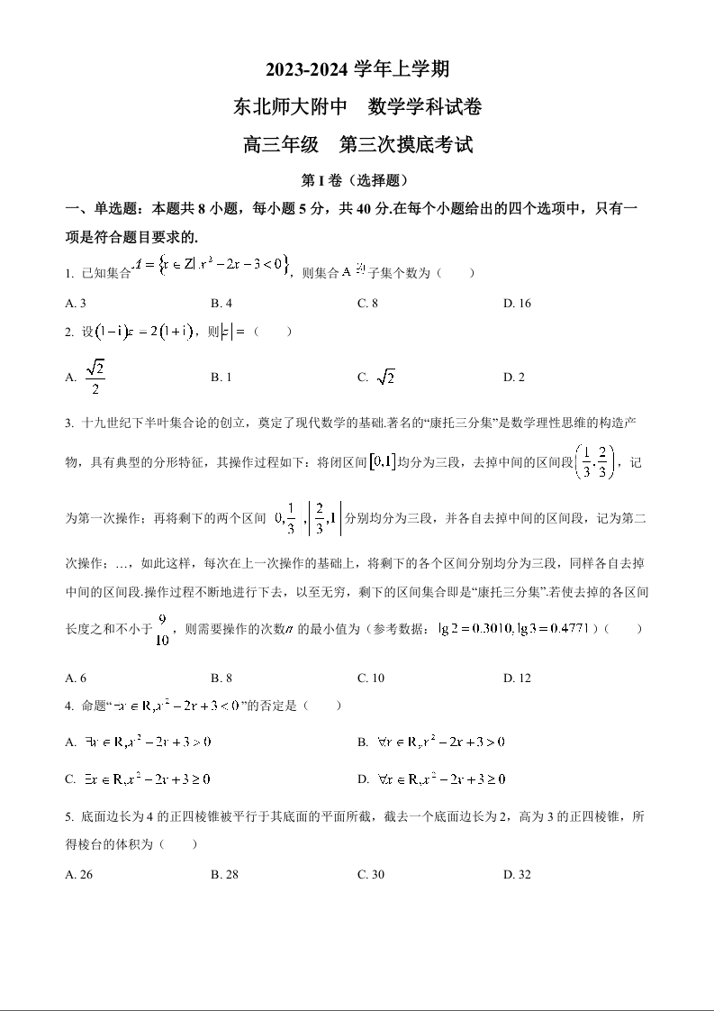 吉林省东北师范大学附属中学2024届高三上学期第三次摸底数学+答案