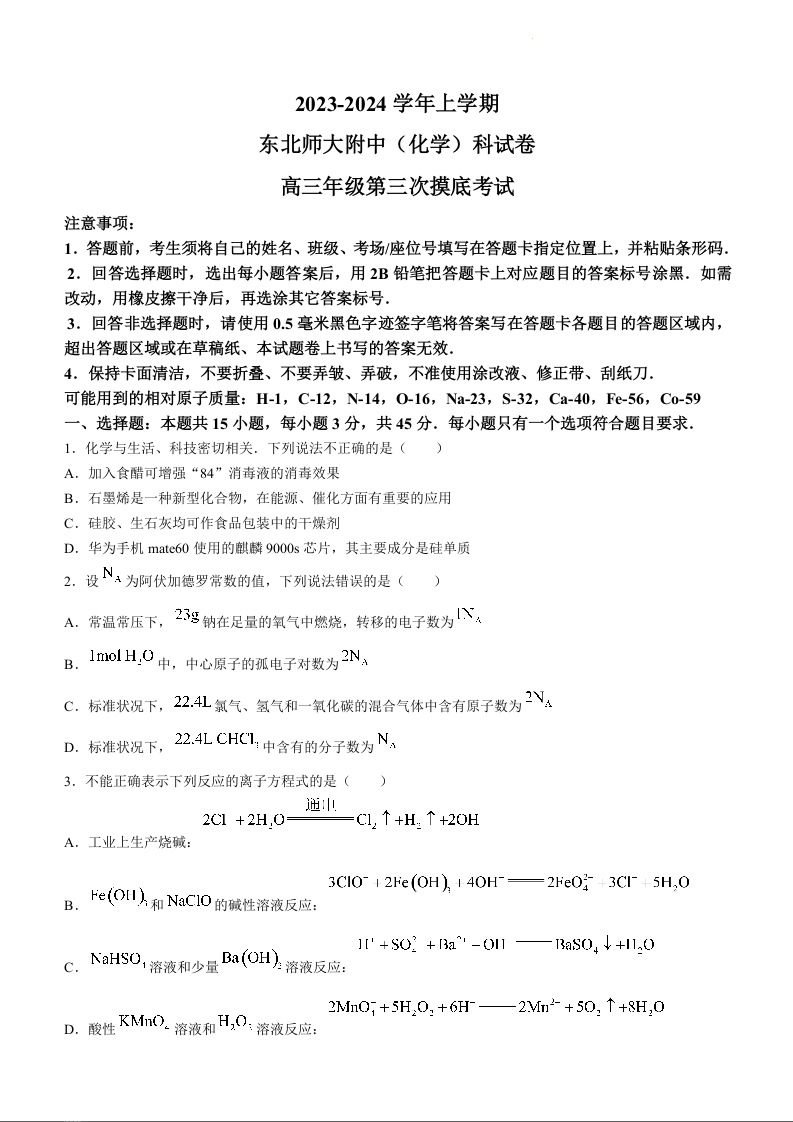 吉林省东北师范大学附属中学2024届高三上学期第三次摸底化学