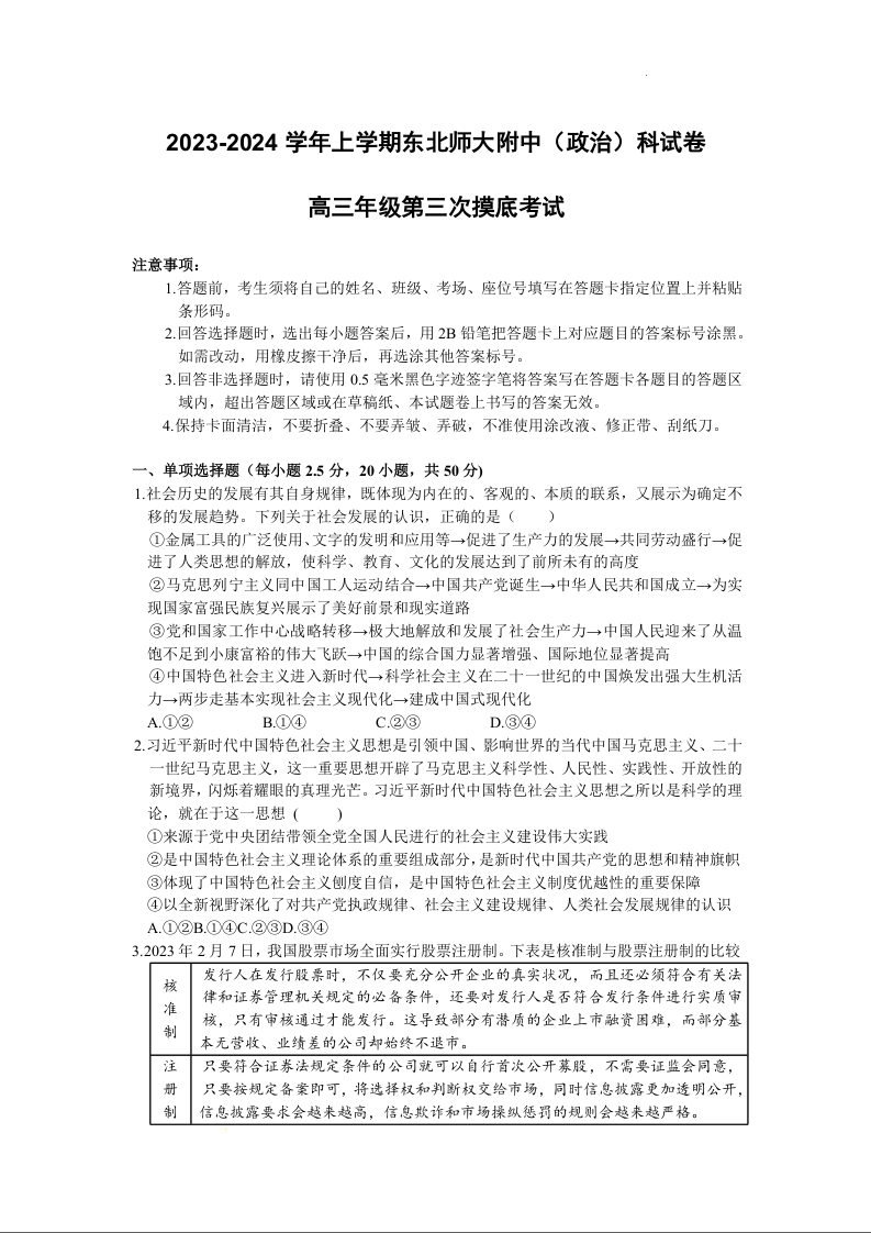 吉林省东北师范大学附属中学2024届高三上学期第三次摸底政治+答案