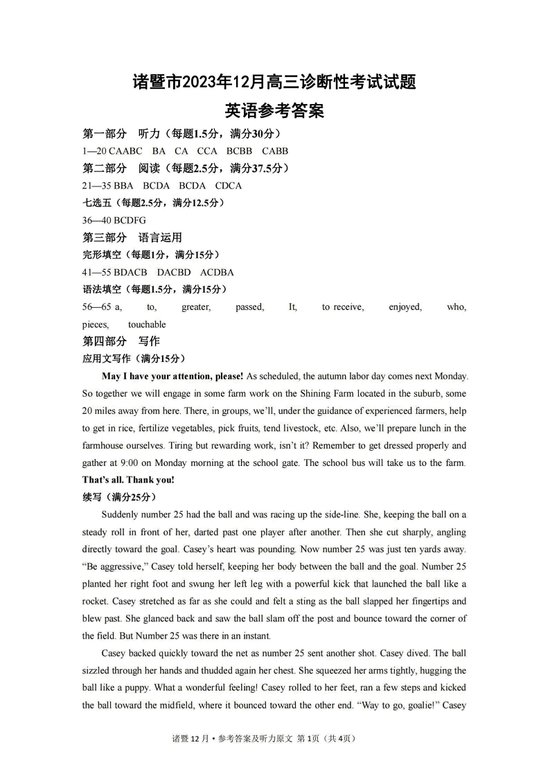 浙江省诸暨市2024届高三上学期12月诊断性考试英语答案