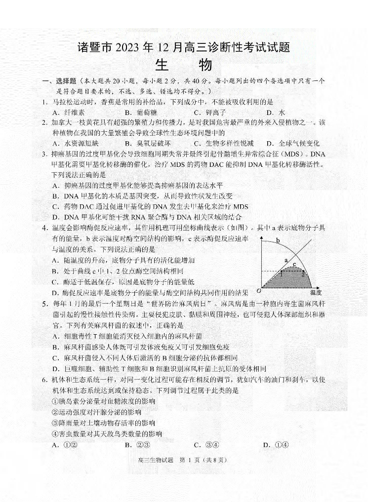 浙江省诸暨市2024届高三上学期12月诊断性考试生物
