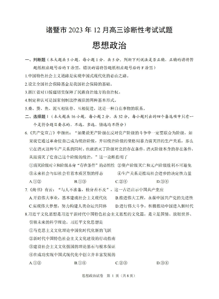 浙江省诸暨市2024届高三上学期12月诊断性考试政治