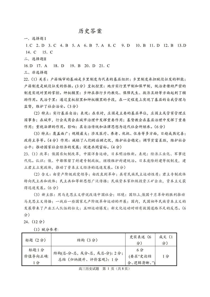 浙江省诸暨市2024届高三上学期12月诊断性考试历史答案