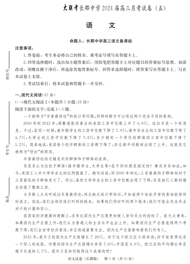 湖南省长沙市长郡中学2024届高三上学期月考(五)语文