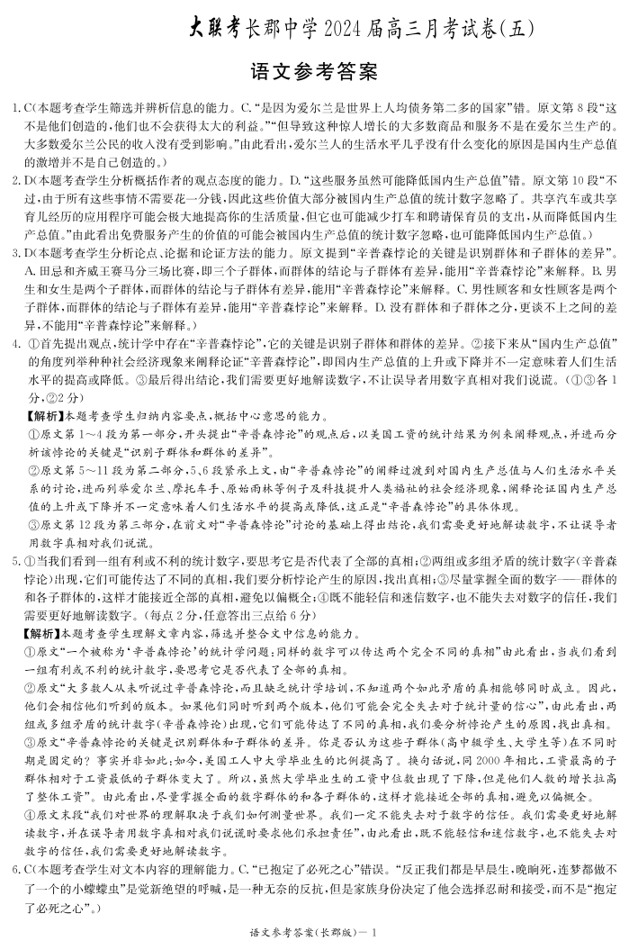 湖南省长沙市长郡中学2024届高三上学期月考(五)语文答案