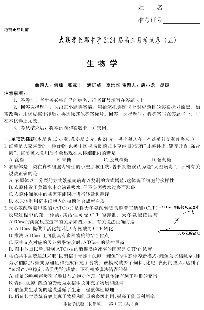 湖南省长沙市长郡中学2024届高三上学期月考(五)生物