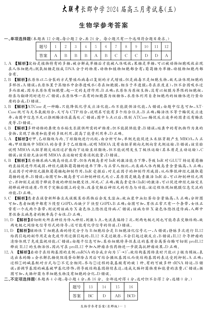 湖南省长沙市长郡中学2024届高三上学期月考(五)生物答案