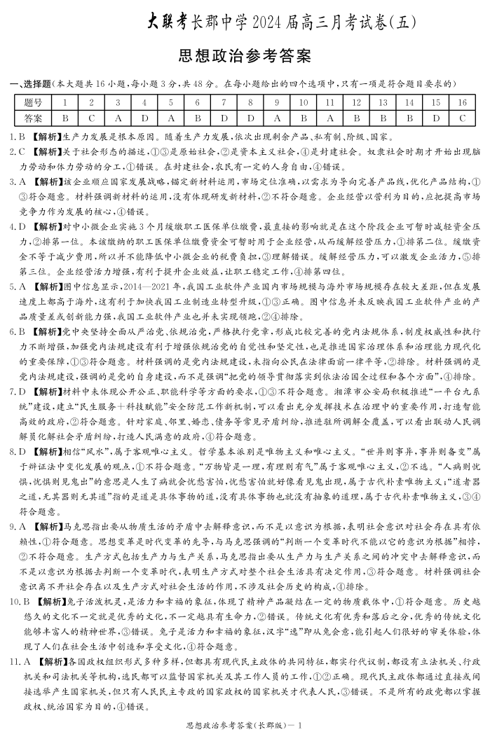 湖南省长沙市长郡中学2024届高三上学期月考(五)政治答案