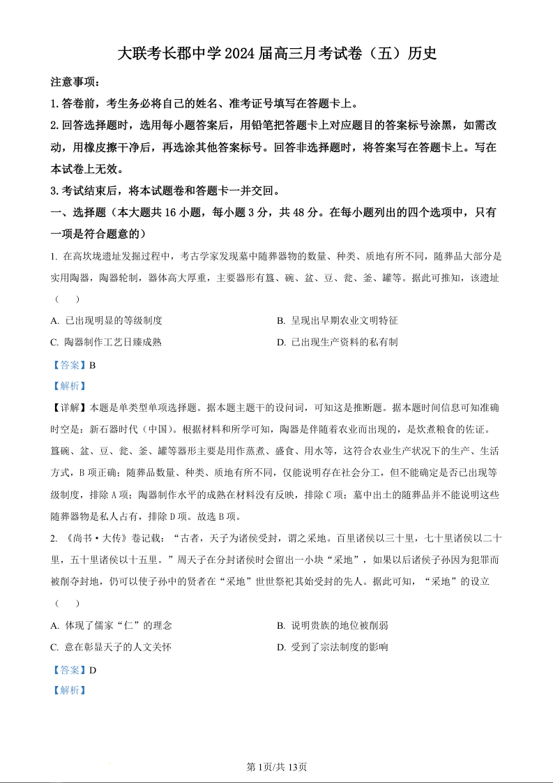 湖南省长沙市长郡中学2024届高三上学期月考(五)历史(精品解析版)