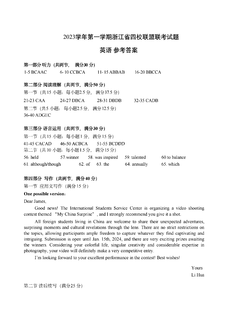 浙江四校联盟2024届高三上学期12月联考英语答案