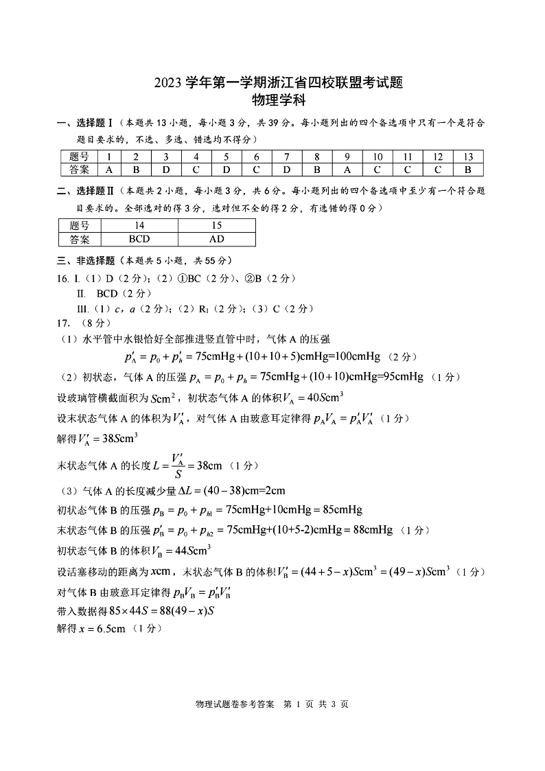 浙江四校联盟2024届高三上学期12月联考物理答案