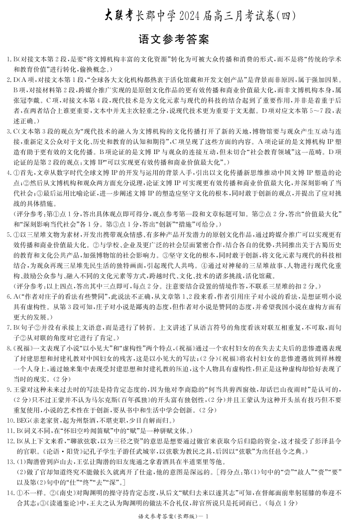 湖南省长郡中学2024届高三上学期月考(四)语文答案