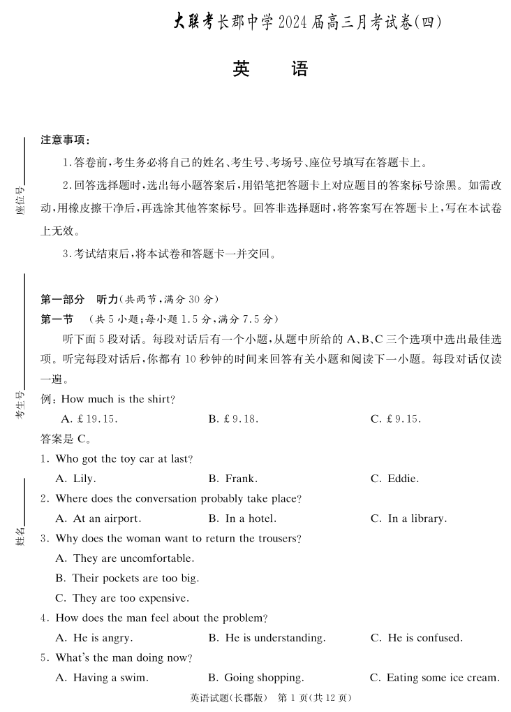 湖南省长郡中学2024届高三上学期月考(四)英语