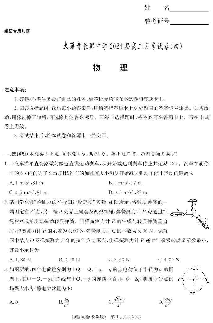 湖南省长郡中学2024届高三上学期月考(四)物理