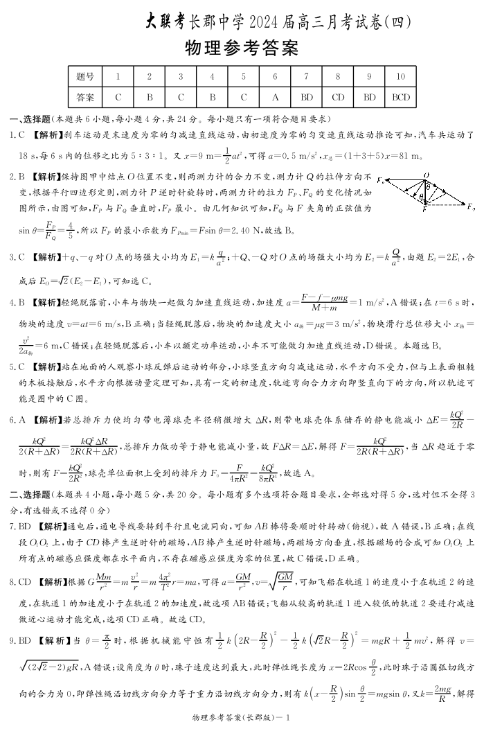 湖南省长郡中学2024届高三上学期月考(四)物理答案