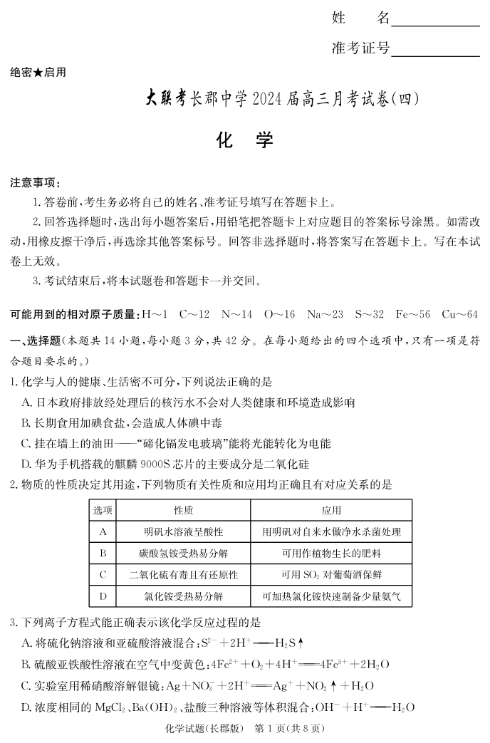 湖南省长郡中学2024届高三上学期月考(四)化学