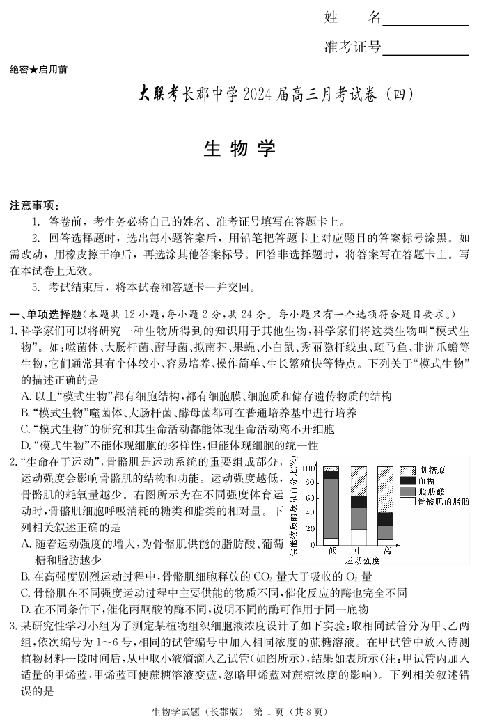 湖南省长郡中学2024届高三上学期月考(四)生物