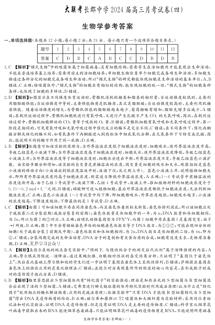 湖南省长郡中学2024届高三上学期月考(四)生物答案