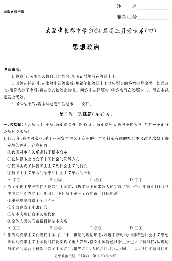 湖南省长郡中学2024届高三上学期月考(四)政治