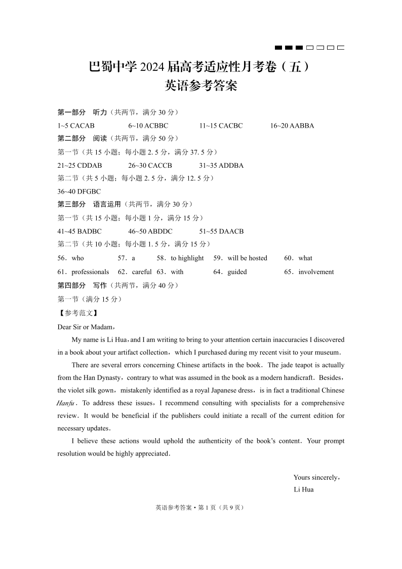重庆市巴蜀中学2024 届高考适应性月考卷 (五)英语答案