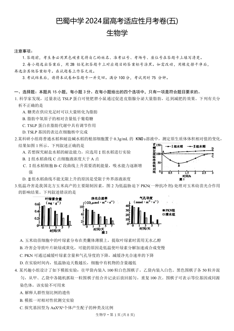 重庆市巴蜀中学2024 届高考适应性月考卷 (五)生物