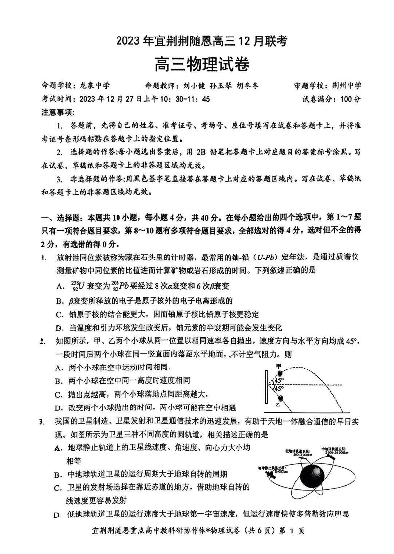 湖北省宜荆荆恩2024届高三上学期12月联考物理+答案