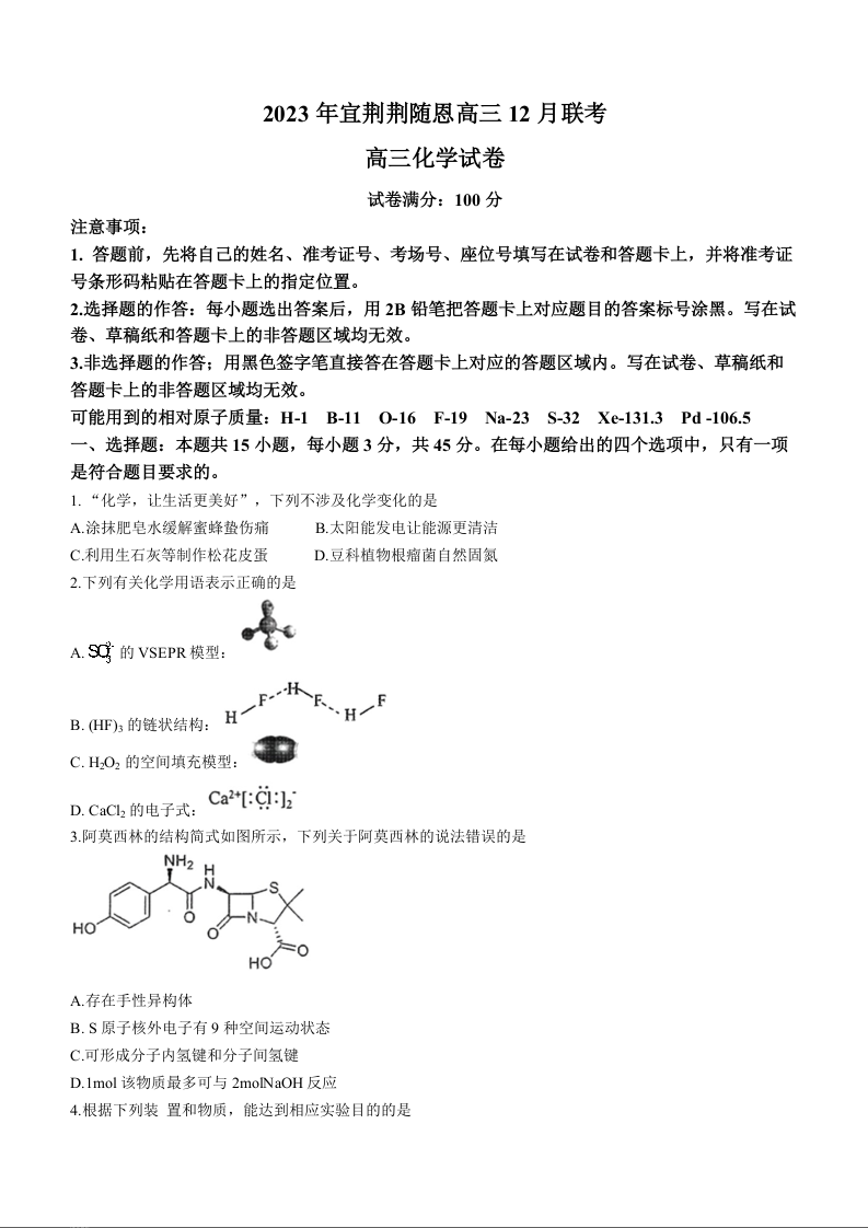 湖北省宜荆荆恩2024届高三上学期12月联考化学+答案