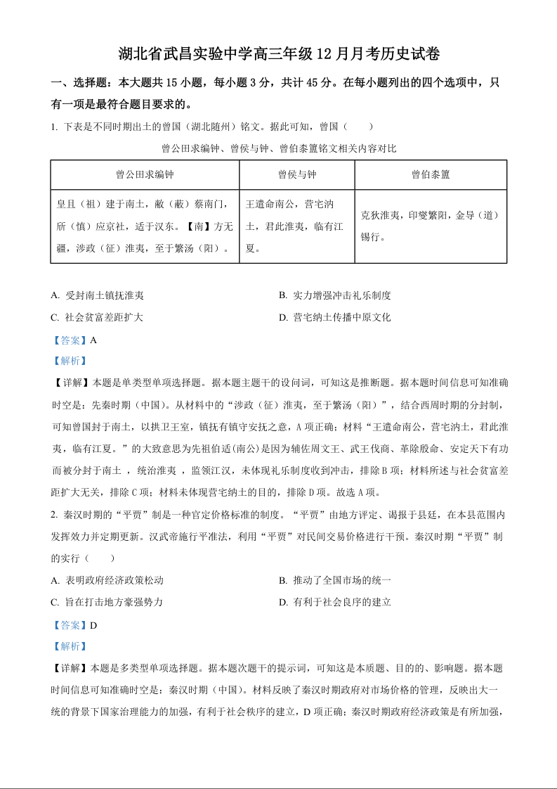 湖北省武昌实验中学2024届高三上学期12月月考历史(精品解析版)
