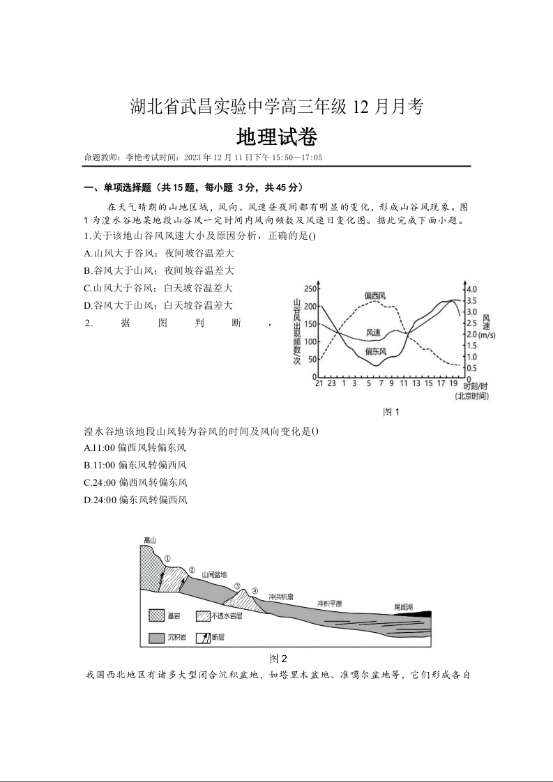 湖北省武昌实验中学2024届高三上学期12月月考地理+答案