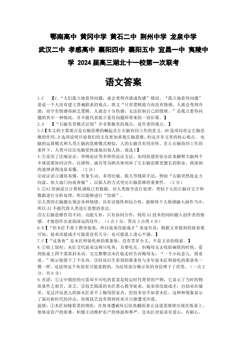湖北省十一校2024届高三上学期第一次联考语文答案