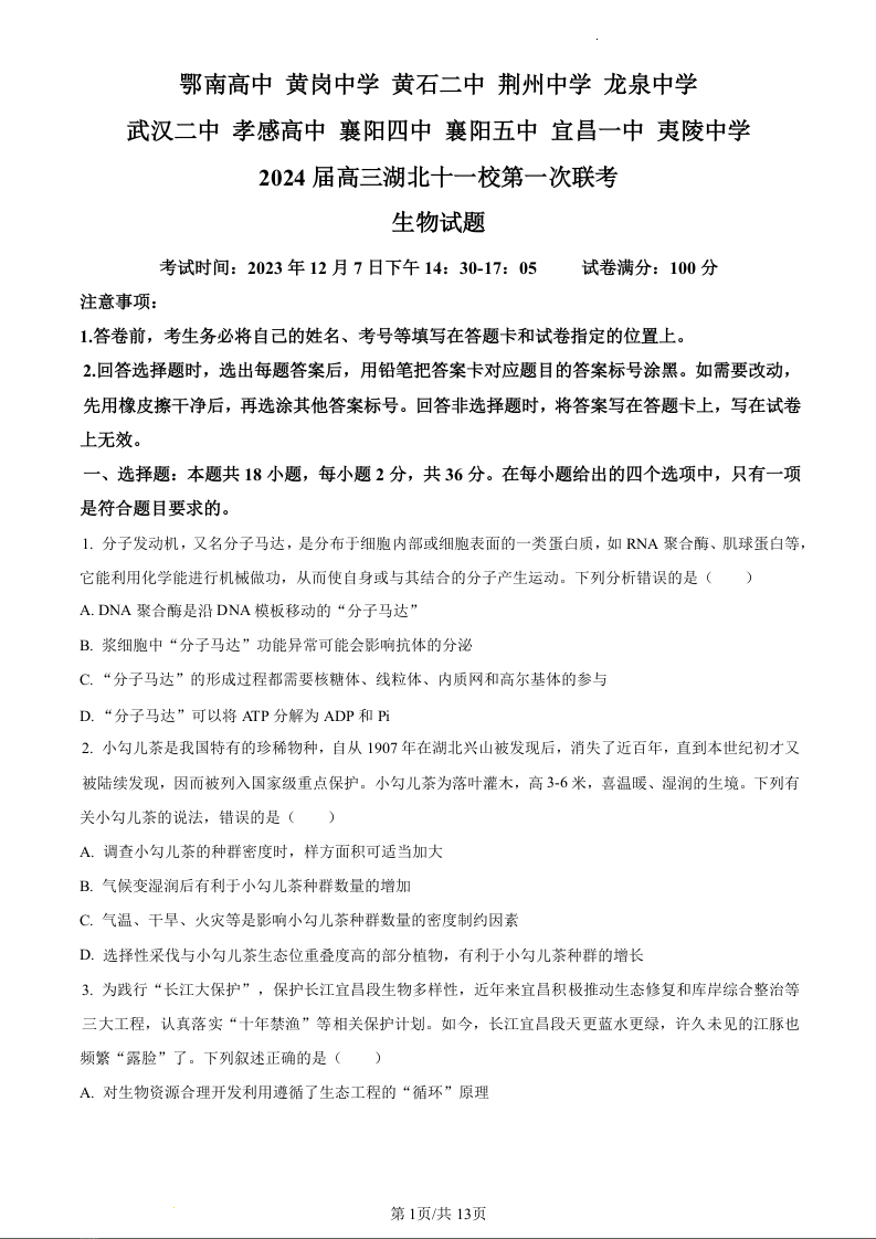 湖北省十一校2024届高三上学期第一次联考生物(原卷版)