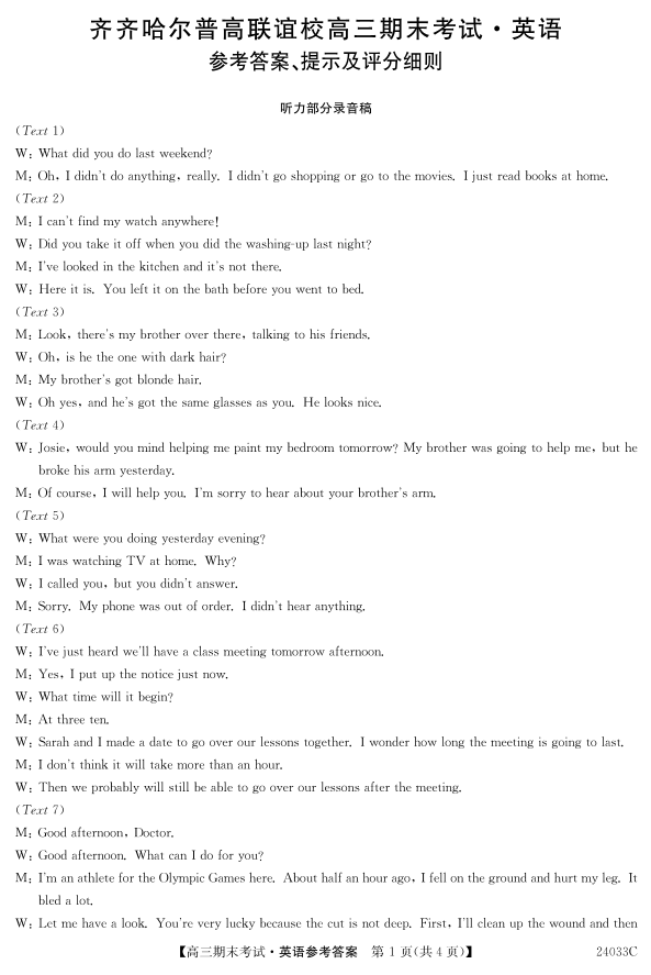 黑龙江省齐齐哈尔市普高联谊校2024届高三上学期12月期末英语答案