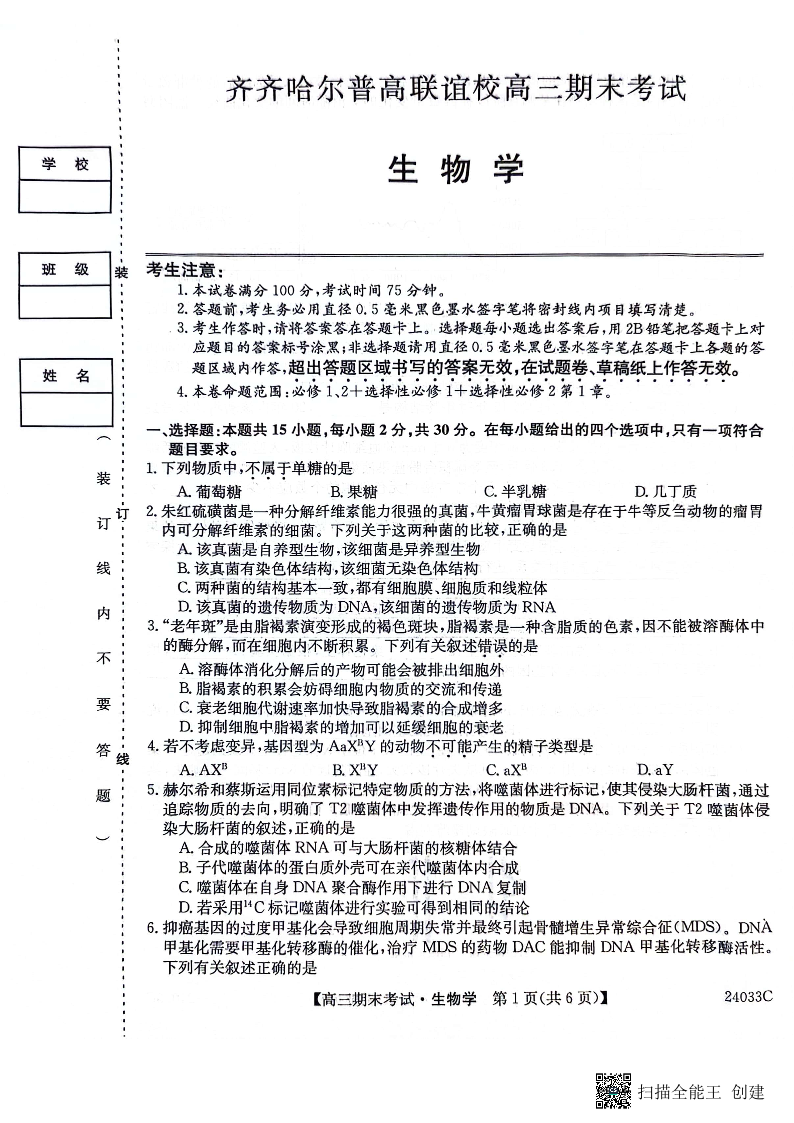 黑龙江省齐齐哈尔市普高联谊校2024届高三上学期12月期末生物