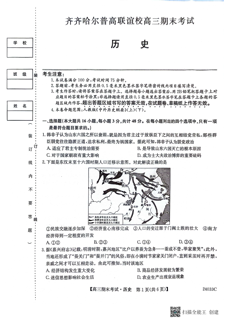 黑龙江省齐齐哈尔市普高联谊校2024届高三上学期12月期末历史