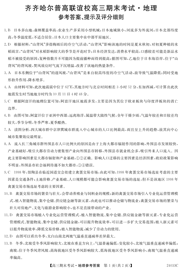 黑龙江省齐齐哈尔市普高联谊校2024届高三上学期12月期末地理答案