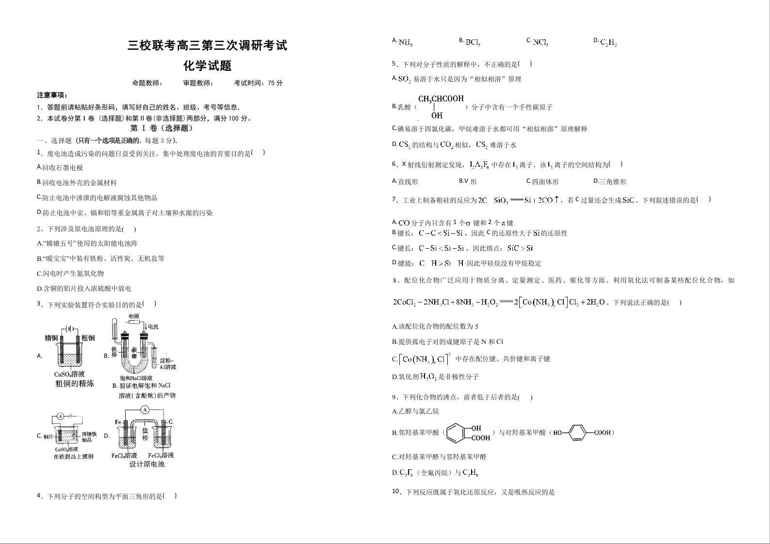黑龙江省佳木斯市三校联考2024届高三上学期第三次调研考试化学+答案