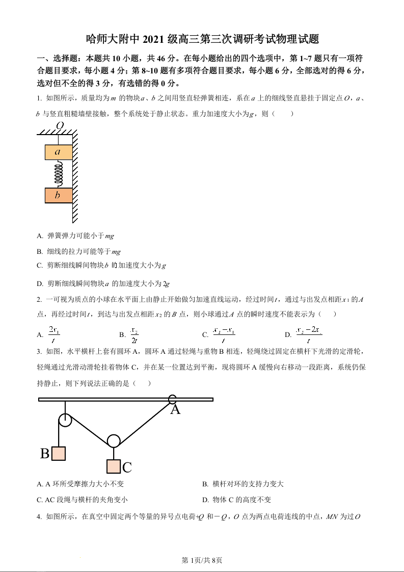 黑龙江省哈尔滨师范大学附属中学2024届高三上学期第三次调研考试(11月期中)物理(原卷版)