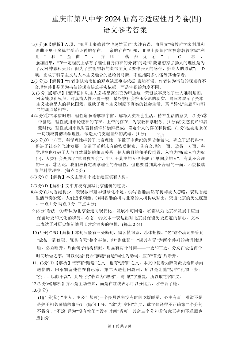 重庆市第八中学2024届高考适应性月考卷(四)语文答案