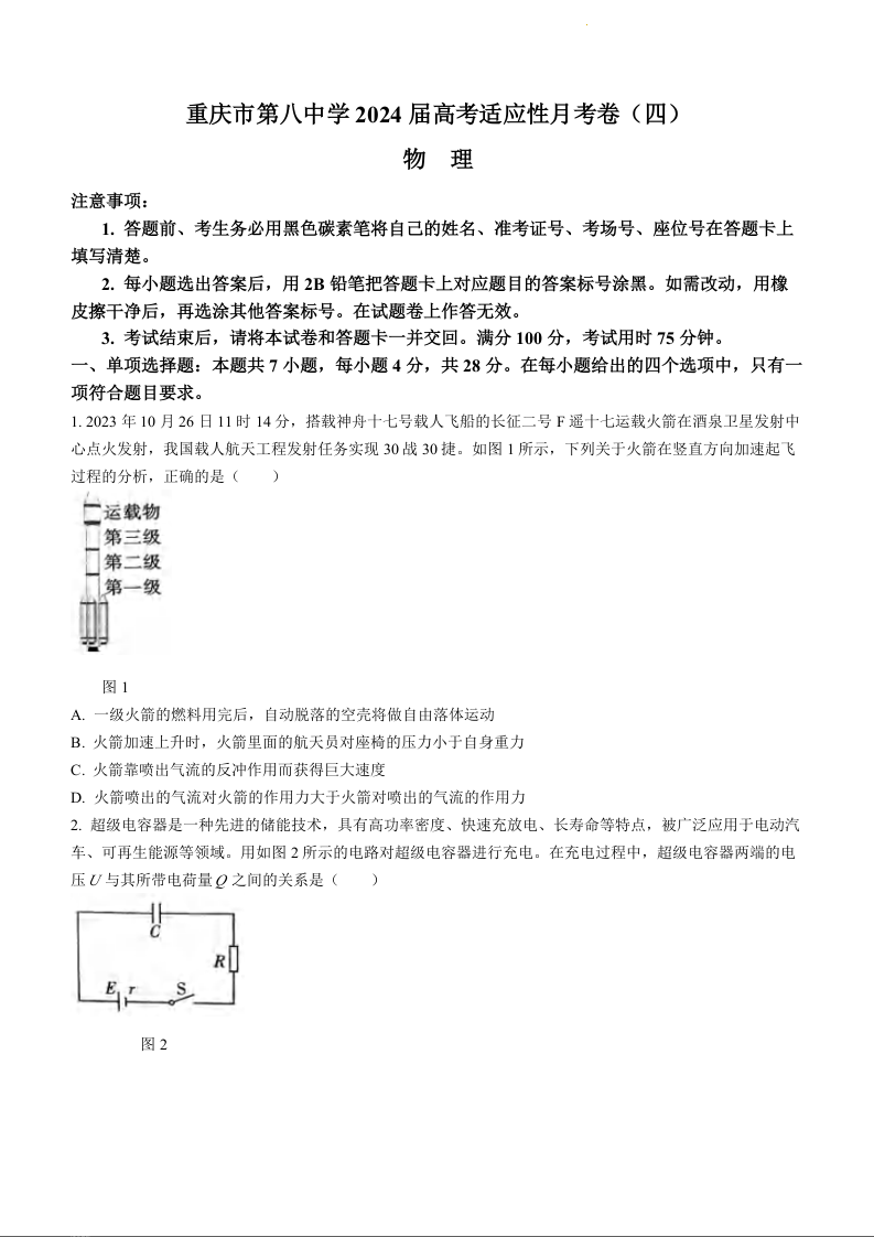 重庆市第八中学2024届高考适应性月考卷(四)物理+答案