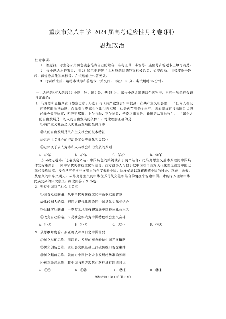 重庆市第八中学2024届高考适应性月考卷(四)政治+答案