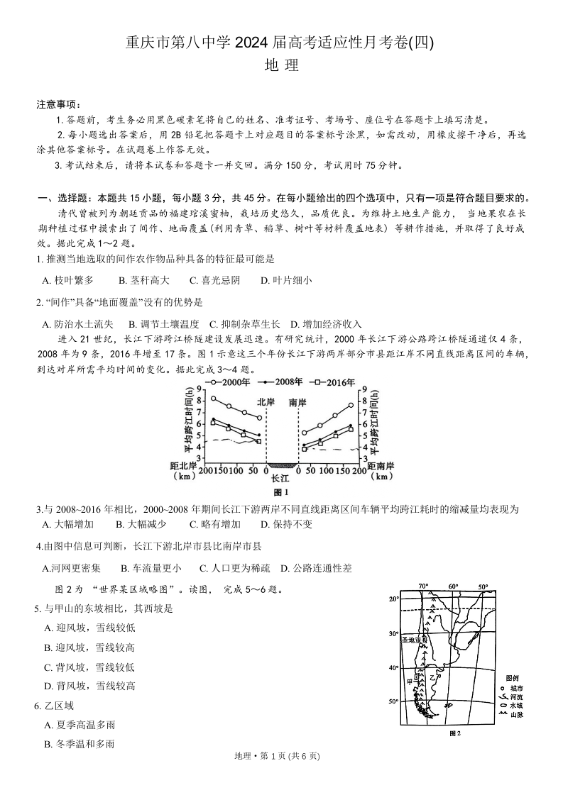 重庆市第八中学2024届高考适应性月考卷(四)地理