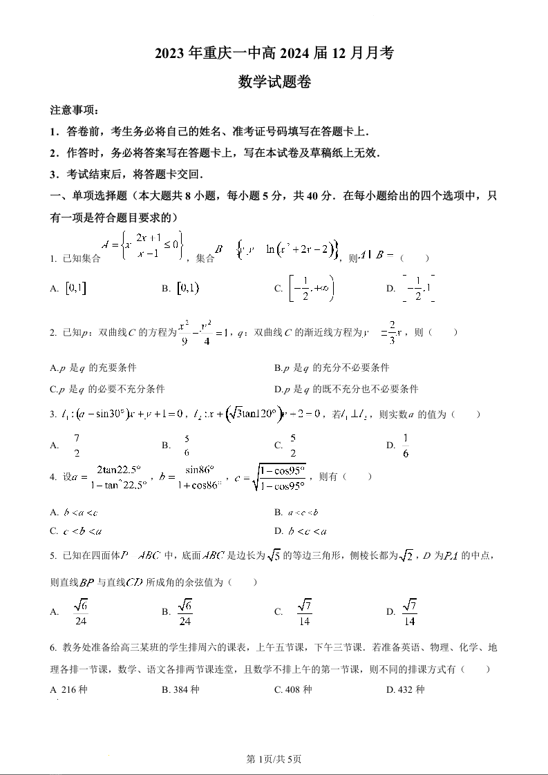 重庆市第一中学校2024届高三上学期12月月考数学(原卷版)