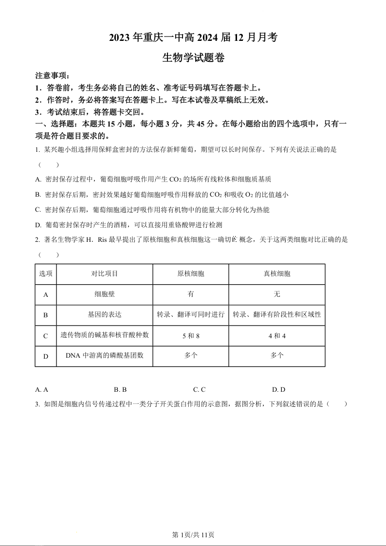 重庆市第一中学校2024届高三上学期12月月考生物(原卷版)