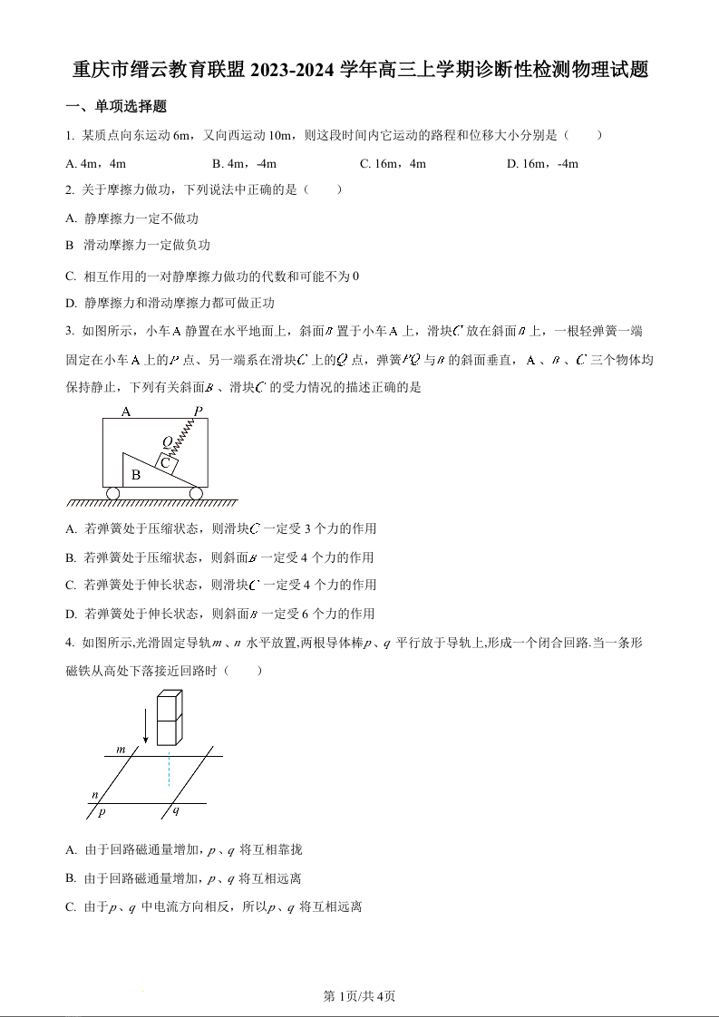 重庆市缙云教育联盟2024届高三上学期第零次诊断性检测物理(原卷版)