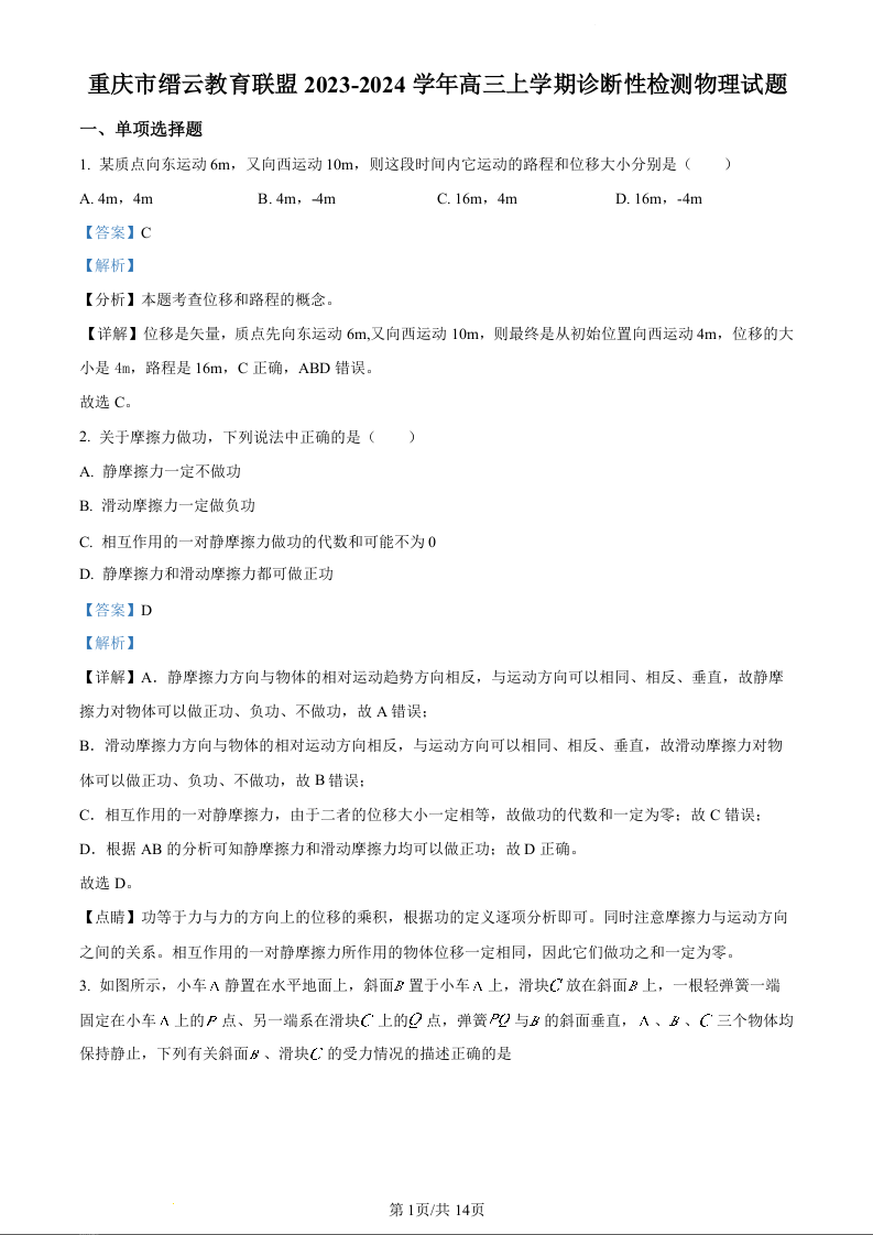 重庆市缙云教育联盟2024届高三上学期第零次诊断性检测物理(精品解析版)