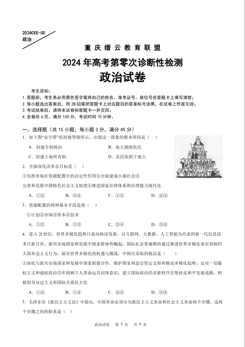 重庆市缙云教育联盟2024届高三上学期第零次诊断性检测政治