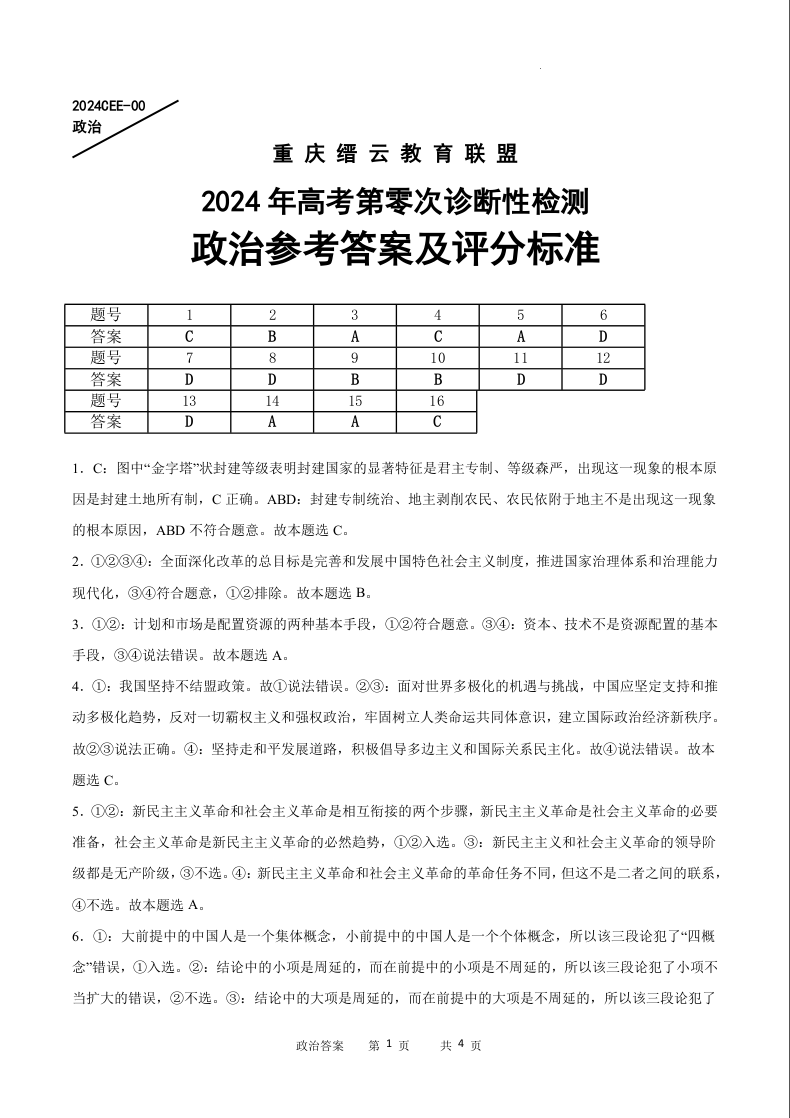 重庆市缙云教育联盟2024届高三上学期第零次诊断性检测政治答案