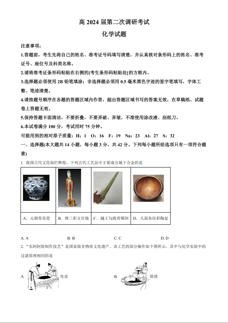 重庆市梁平区2024届高三上学期第二次调研考试化学+答案