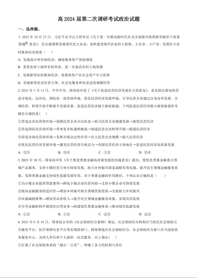 重庆市梁平区2024届高三上学期第二次调研考试政治+答案